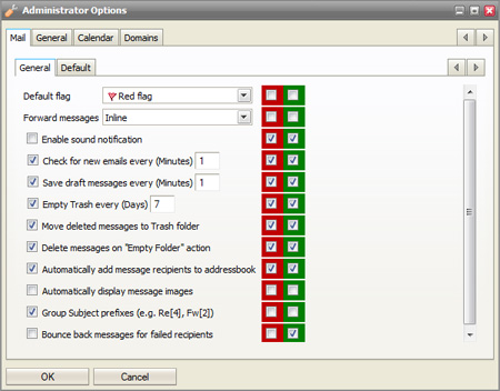 Le Client Web d'IceWarp offre aux administrateurs le contrôle détaillé de différentes fonctionnalités au niveau domaine ou utilisateur tels que l'accès à la Messagerie Instantanée et à la Voix sur IP, la possibilité de masquer l'onglet Anti Spam ou la fonction SmartAttach et la possibilité de désactiver la modification du mot de passe.