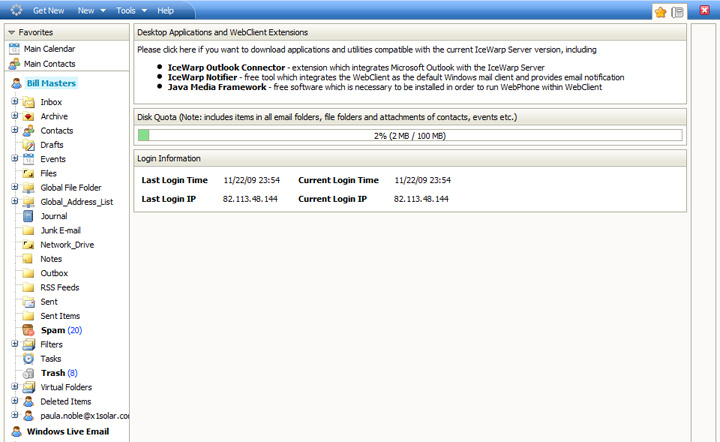 Le Client Web d'IceWarp comprend aussi la gestion des certificats personnels, la messagerie SMS, l'accès à des dossiers de fichiers du serveur, un lecteur RSS, l'accès POP3 et IMAP à tout compte externe, une page d'accueil personnalisable, le partage de fichiers et l'utilisation du Client Web comme client de messagerie par défaut pour Windows.